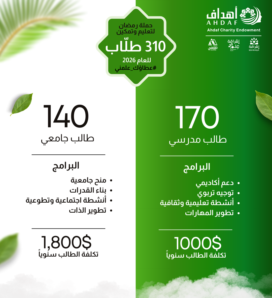 تهدف هذه الحملة إلى جمع الزكاة والصدقات لدعم أكثر من 300 طالب في لبنان، من طلاب المدارس والجامعات، ومساعدتهم على متابعة تعليمهم وبناء مستقبلهم.
